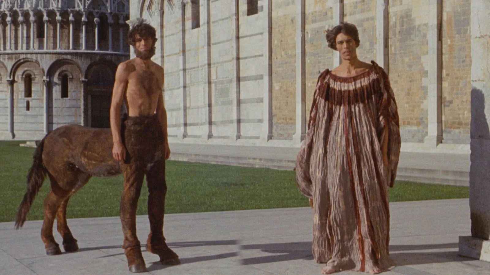 Pasolini acts in the film himself as a student of the early Renaissance painter Giotto. His character works to complete an enormous fresco, which we see nearly finished in the film’s last scene. Unlike his self-insert in The Canterbury Tales as Chaucer, this appearance imbeds an interesting meta-critique: The artist (Pasolini) painted very little himself, given the scale of the piece, and mostly relied on his helpers from the village. These men go off drinking when the painting is finished, and the artist is left to admire the image, no longer observed by the people who made it. Art—and especially film—is collaborative. Given this, can you ever truly own what you produce? And who is it for if the real artists don’t care to look at it?